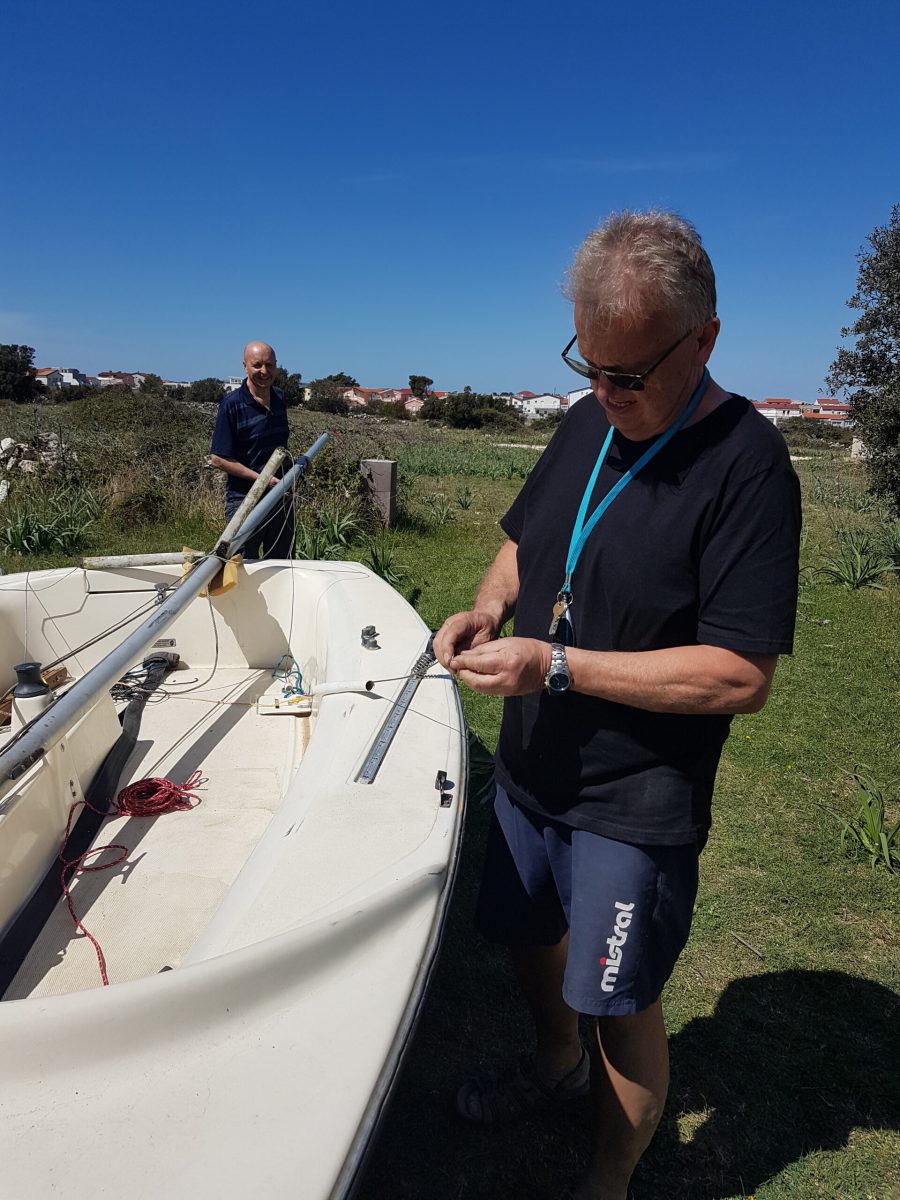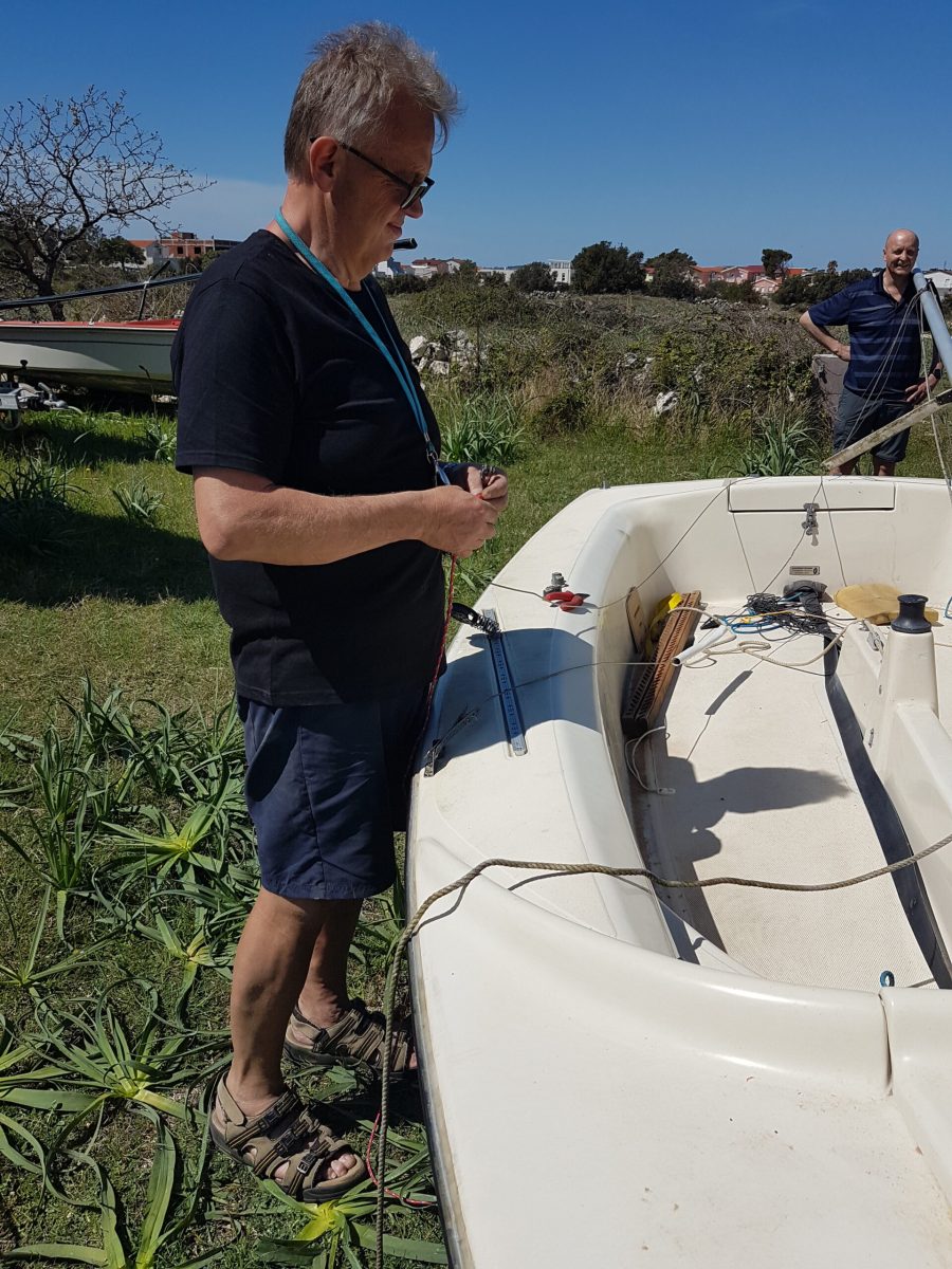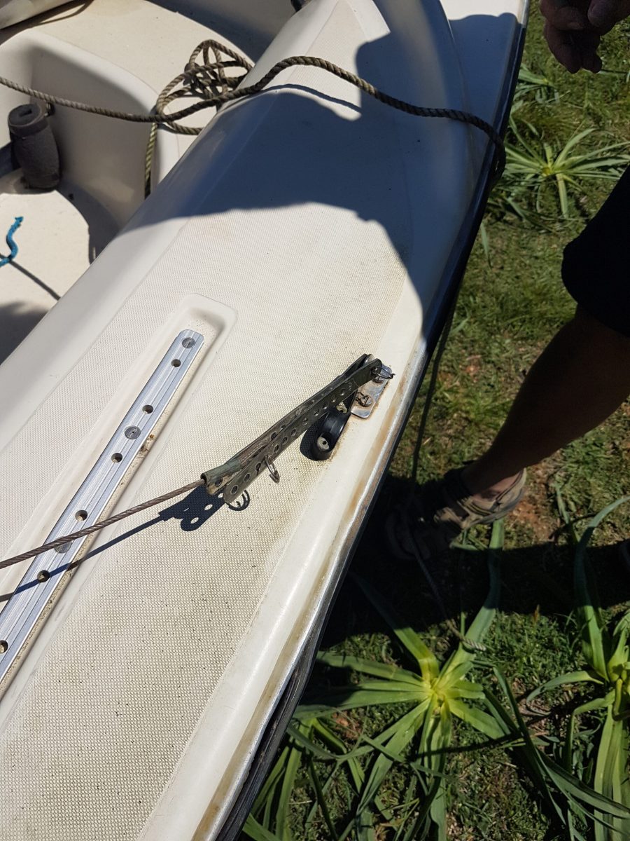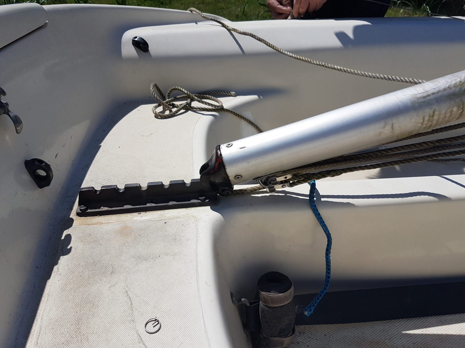 1. Den Mast von hinten so auf das Boot legen, dass die Wanten seitlich befestigt und festgeschraubt werden können.