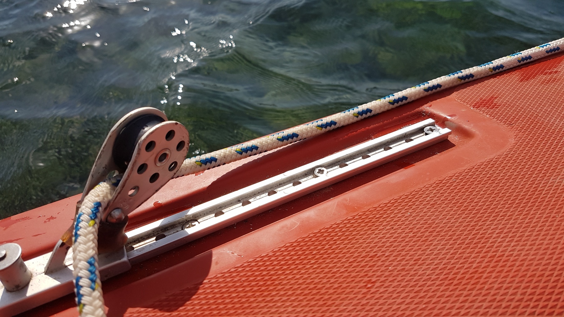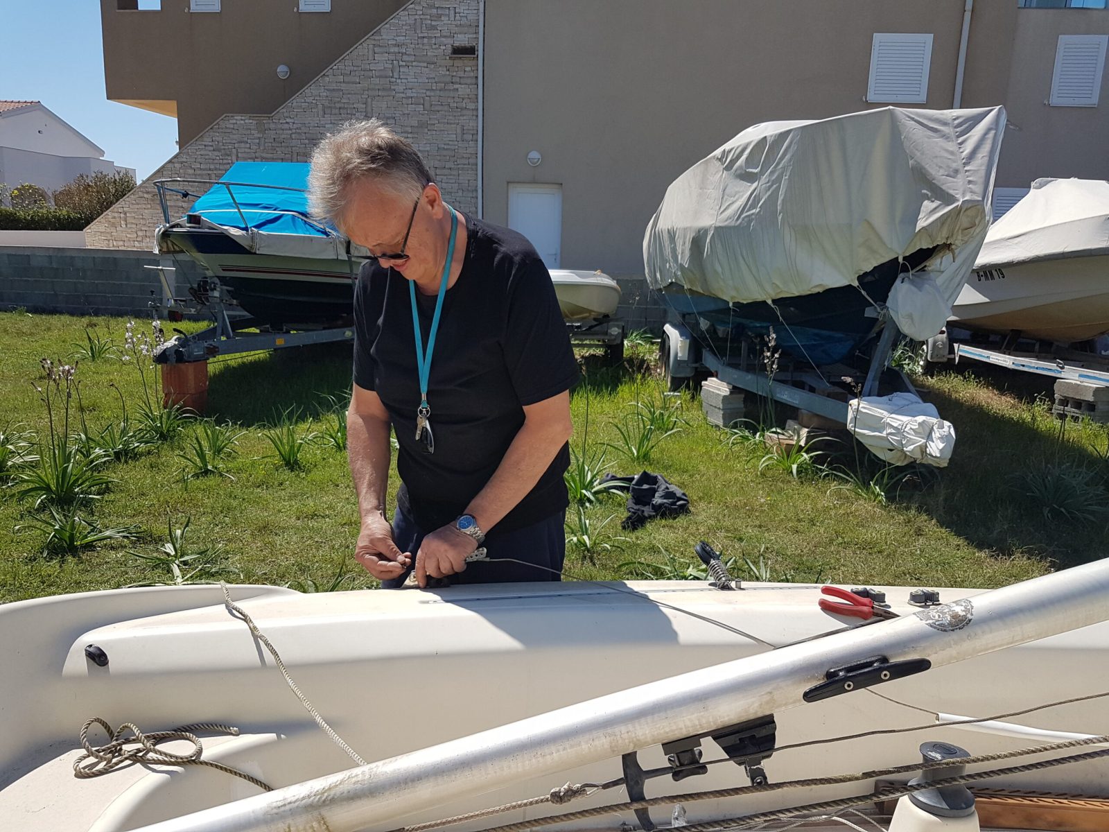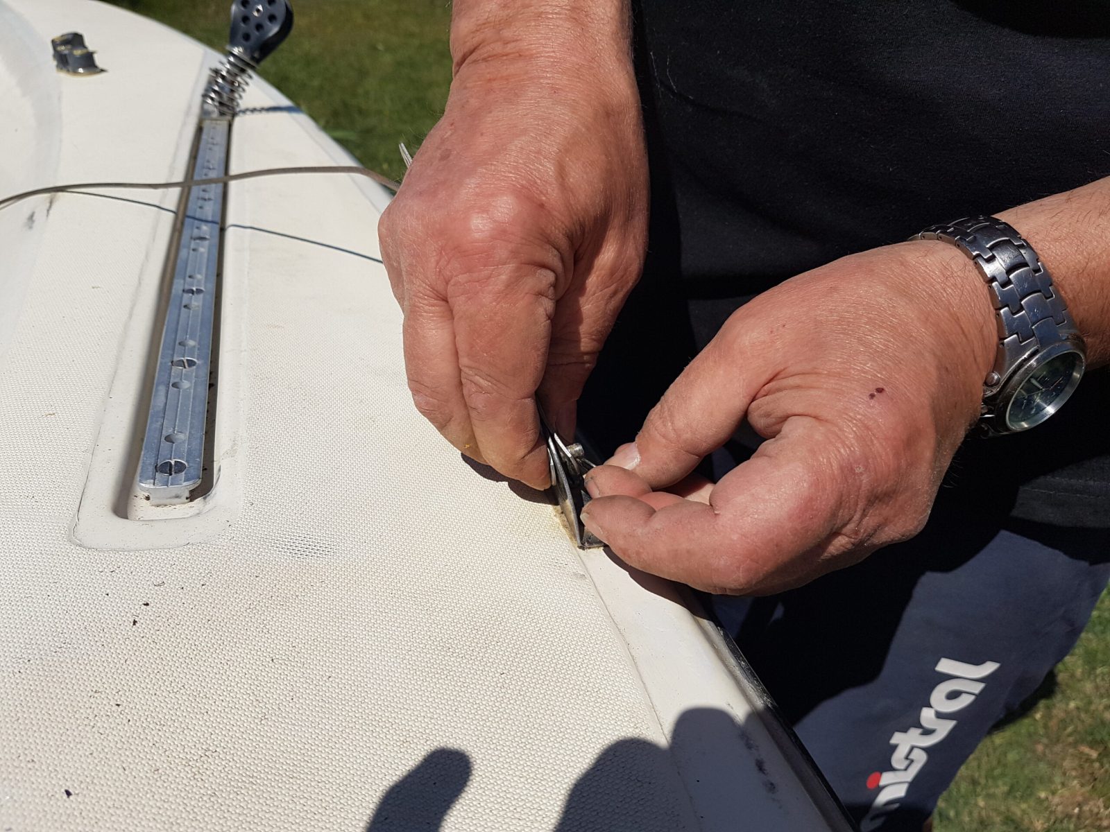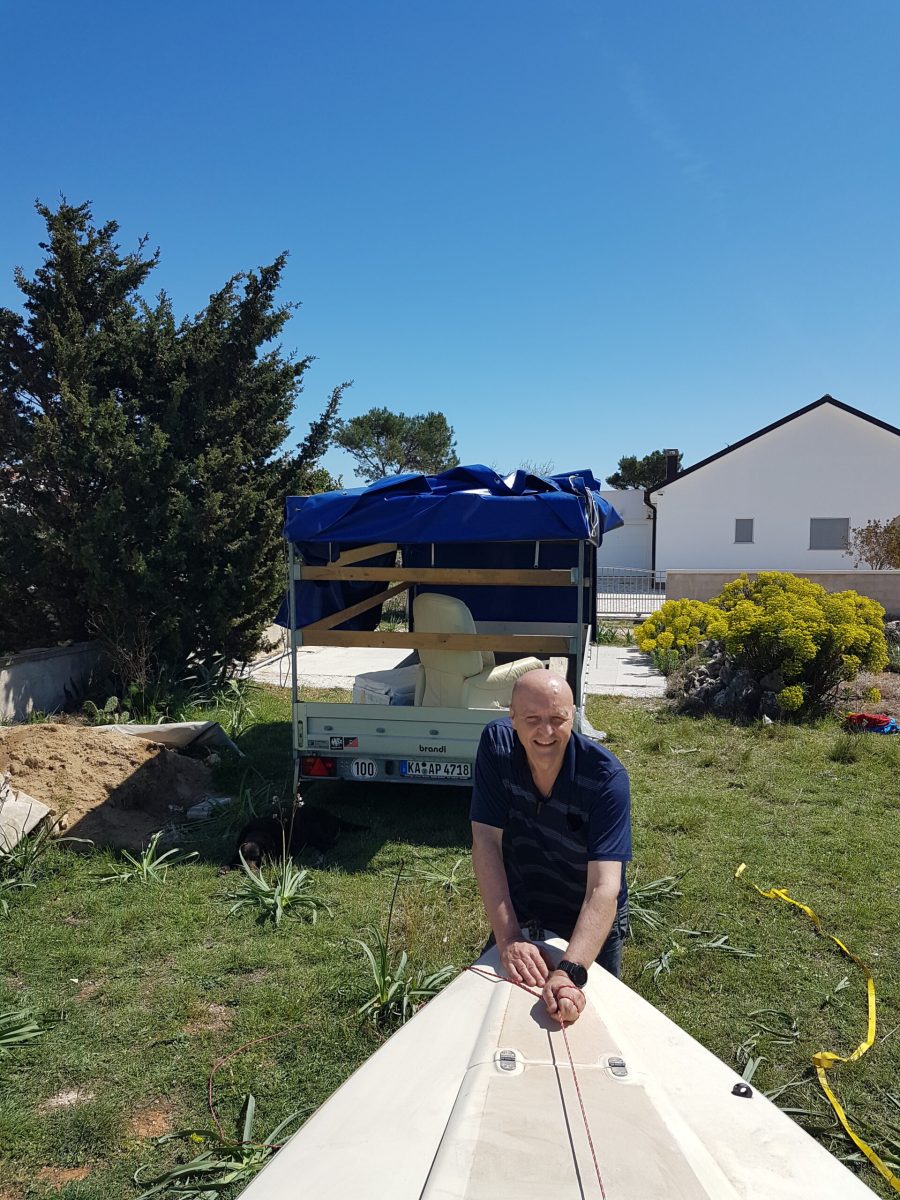 1. Den Mast von hinten so auf das Boot legen, dass die Wanten seitlich befestigt und festgeschraubt werden können.