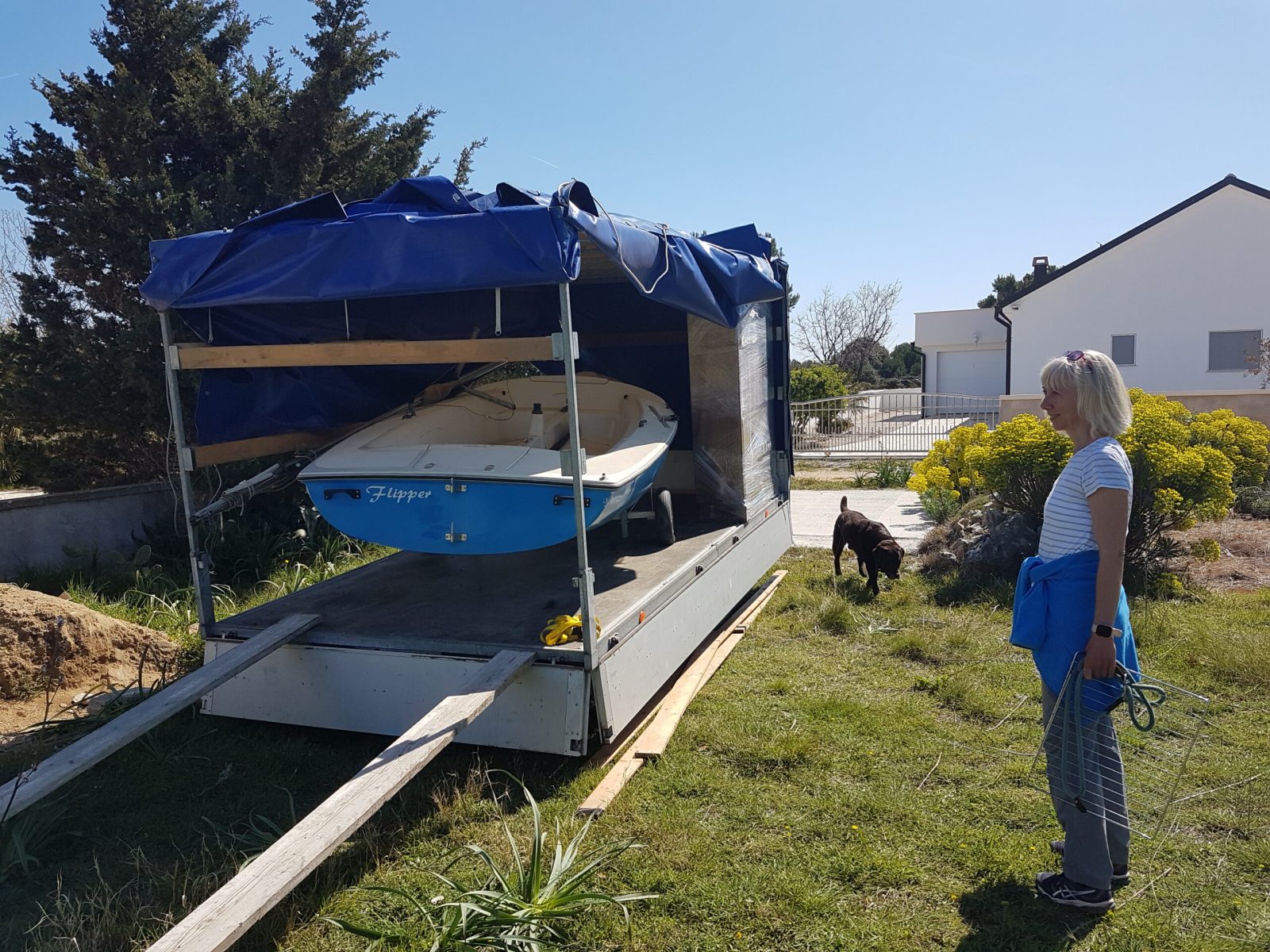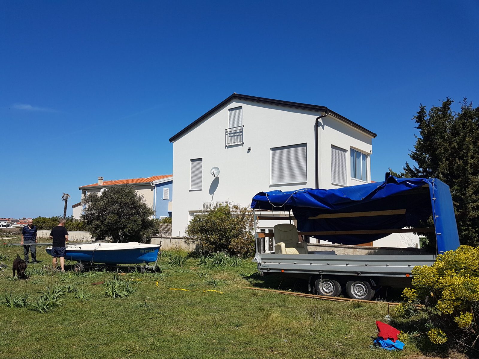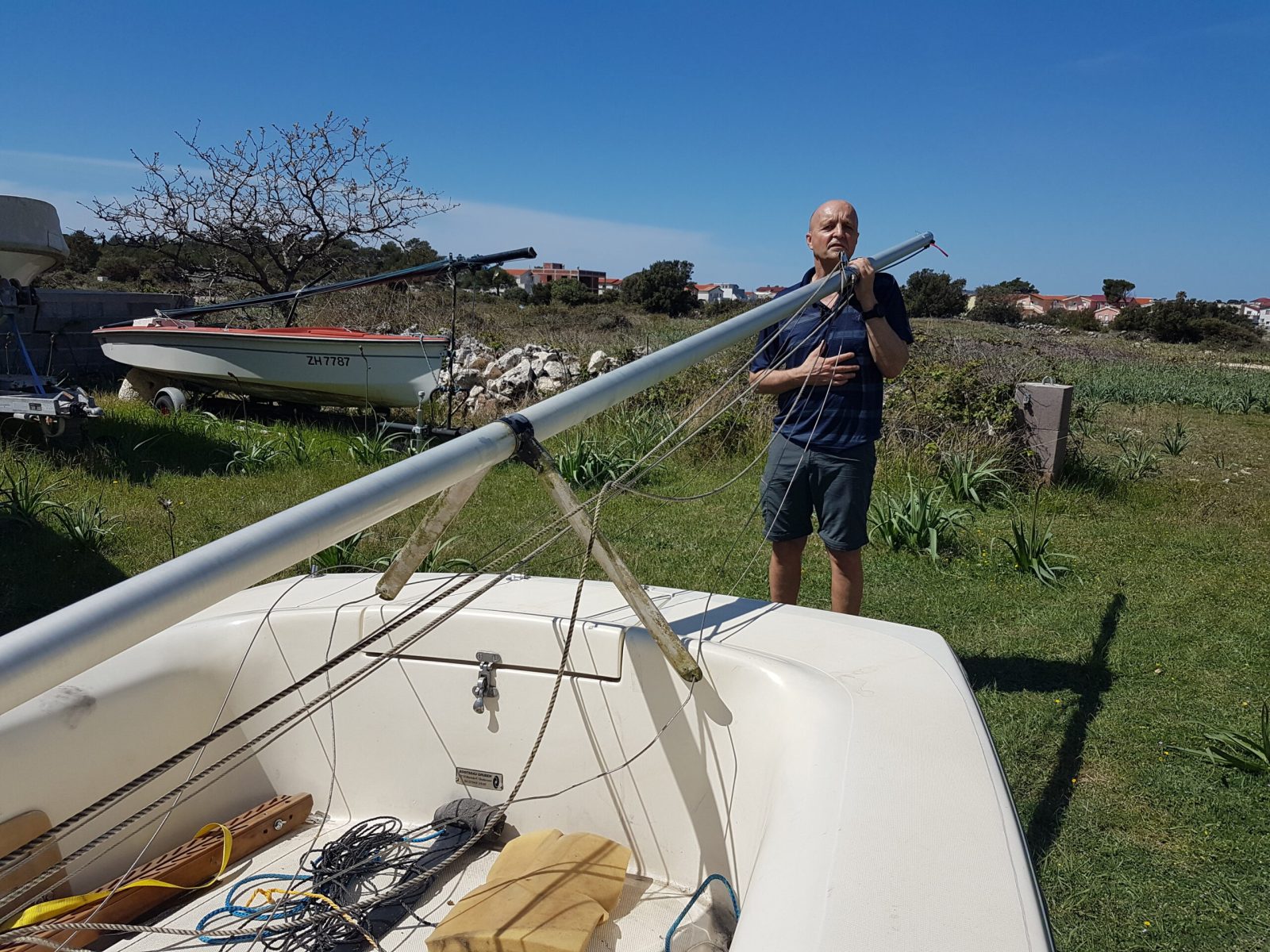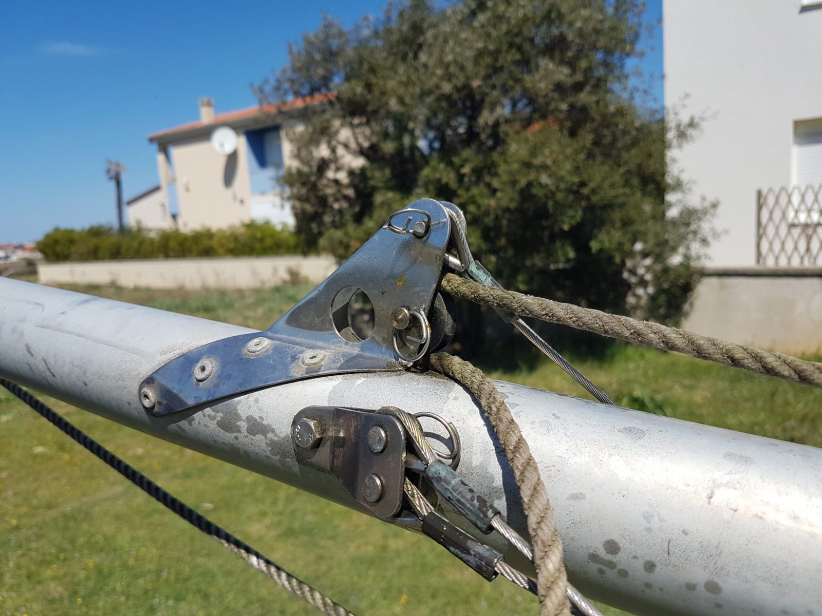 Der Mast wird mit zwei Wanten (seitlich) und dem Stag (vorne) abgestützt.